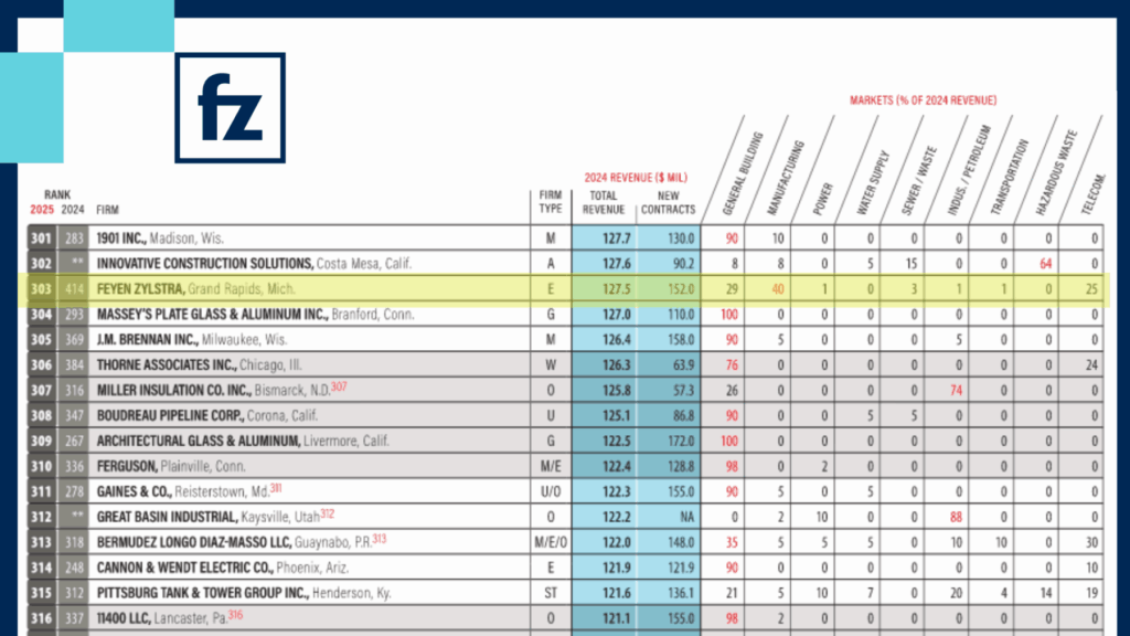 We’re proud to share that Feyen Zylstra has been ranked #303 on Engineering News-Record’s (ENR) Top 600 National Contractors…